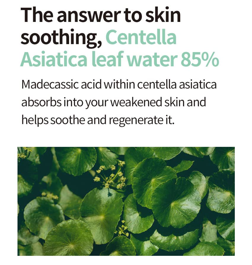 - The answer to skin soothing, Centella Asiatica Leaf Water 85% Madecassic Acid within Centella Asiatica absorbs into your weakened skin and helps soothe and regenerate it. Clean off dead skin cells and residue, soothe and hydrate your skin. Remove various residue with PHA ingredients and carbonated water that help exfoliate. The Green Tea soothes skin, minimizes pores and Chamomile Extract moisturizes and soothes the skin, blocks moisture evaporation.