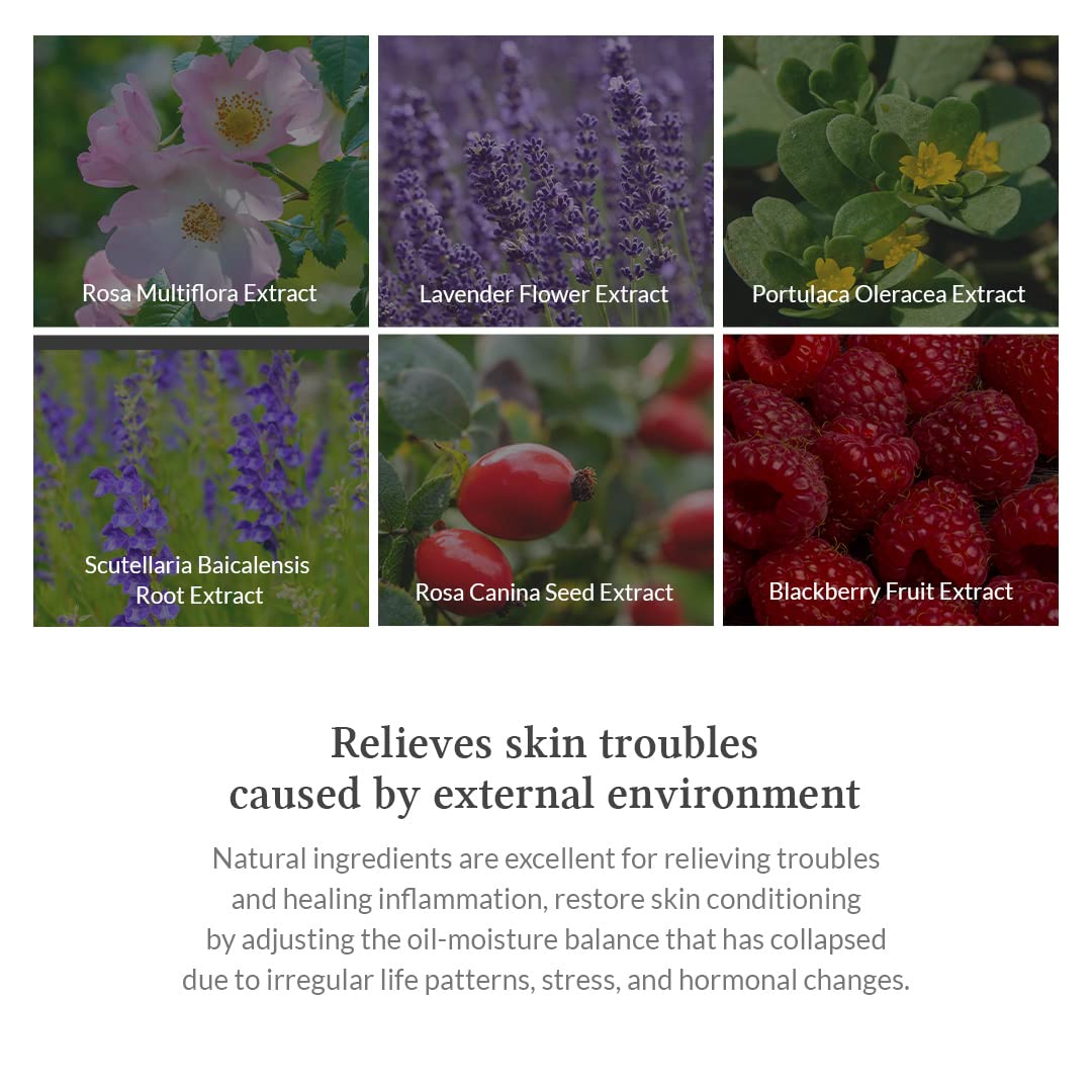 - Consists of naturally-derived ingredients such as Lavender Extract and Rosa Canina Seed Extract that help maintain the oil-moisture balance of the skin from external irritations and stress.