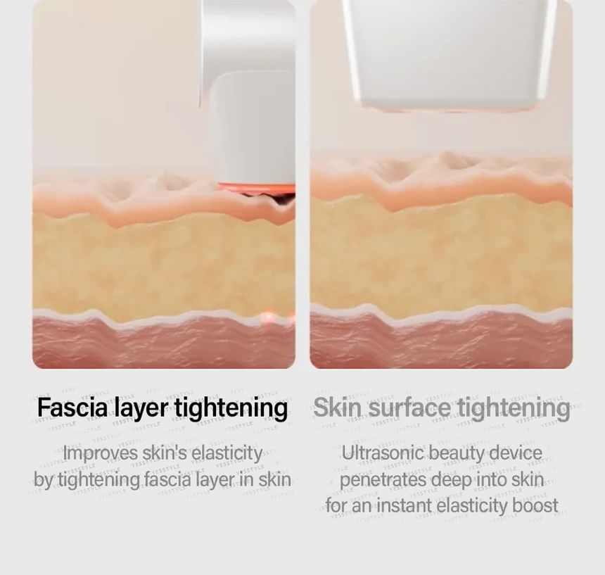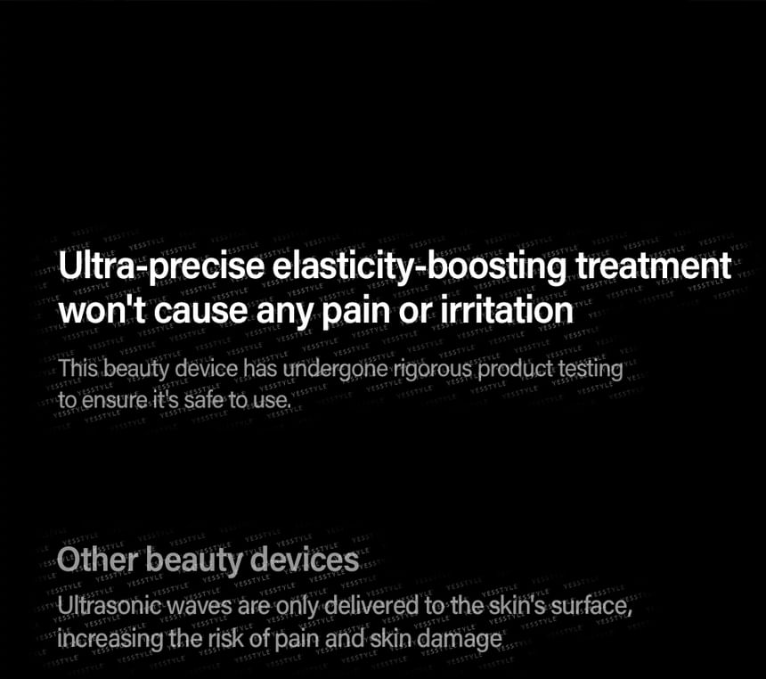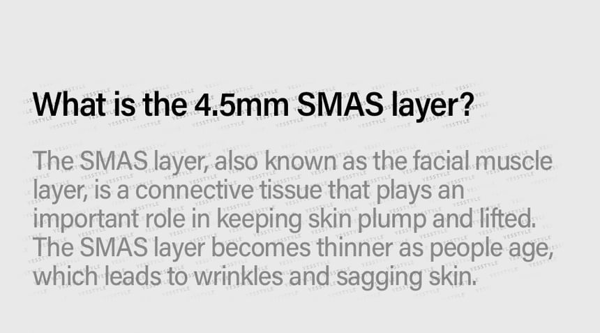 - This device delivers powerful and delicate ultrasonic waves to SMAS (superficial musculoaponeurotic system) which are 4.5mm inside the skin without any skin damage and help raise loose skin elasticity.